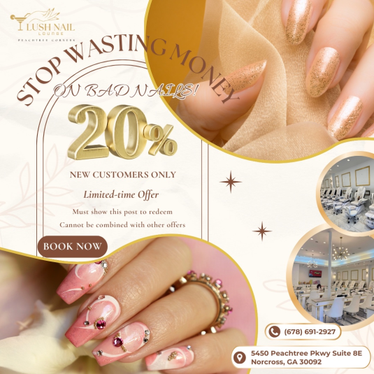 At Lush Nail Lounge, we pride ourselves on being the go-to destination for those seeking high-quality, professional beauty services from head to toe. With our experienced and dedicated team of nail technicians, we are committed to providing you with enjoyable and memorable beauty experiences.At our salon, we always prioritize customer satisfaction and health. We use only top-quality products and the latest technology to ensure that each visit is both wonderful and safe.Moreover, beyond beautifying you, we also create a relaxing and comfortable environment where you can unwind and enjoy your private moments.Come and experience our exceptional services at Lush Nail Lounge. Gift Certificates Available — Appointments & Walk-ins Welcome!